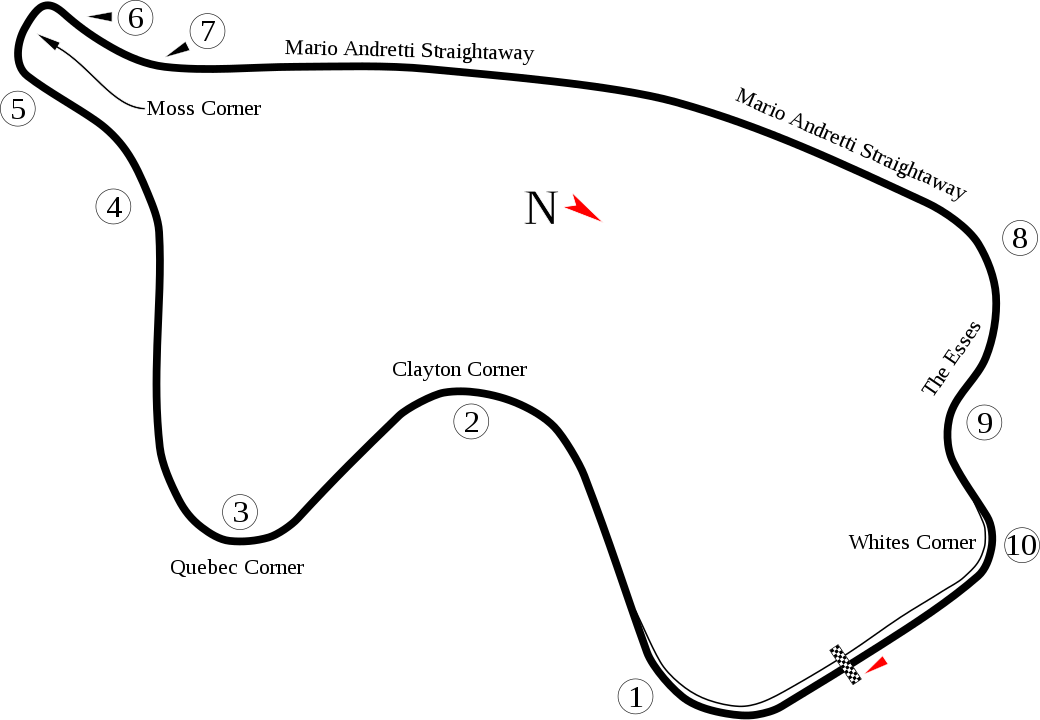 Eine Runde auf der sehr schnellen Rennstrecke beginnt auf der kurzen Start-Ziel-Geraden, welche in eine langgezogene 90°-Rechtskurve führt. Nach der Kurve fällt die Strecke stark ab und geht nach einer kurzen Geraden in die zweite Kurve, die Clayton Corner über. Diese Linkskurve ist ebenfalls langgezogen und führt direkt in die etwas engere Quebec Corner, welche wiederum rechtsherum geht. Durch eine Vollgas-Linkskurve geht es dann auf den stärksten Bremspunkt vor der Moss Corner zu. Diese doppelte Rechtskurve ist die langsamste Stelle des Kurses und führt auf die lange Gegengerade, die Mario Andretti Straightaway. Es folgt noch eine mittelschnelle Kurvenkombination, welche als The Esses bekannt ist. Diese Rechts-links-rechts-Kombination wird immer enger und führt wieder auf die Start-Ziel-Gerade.